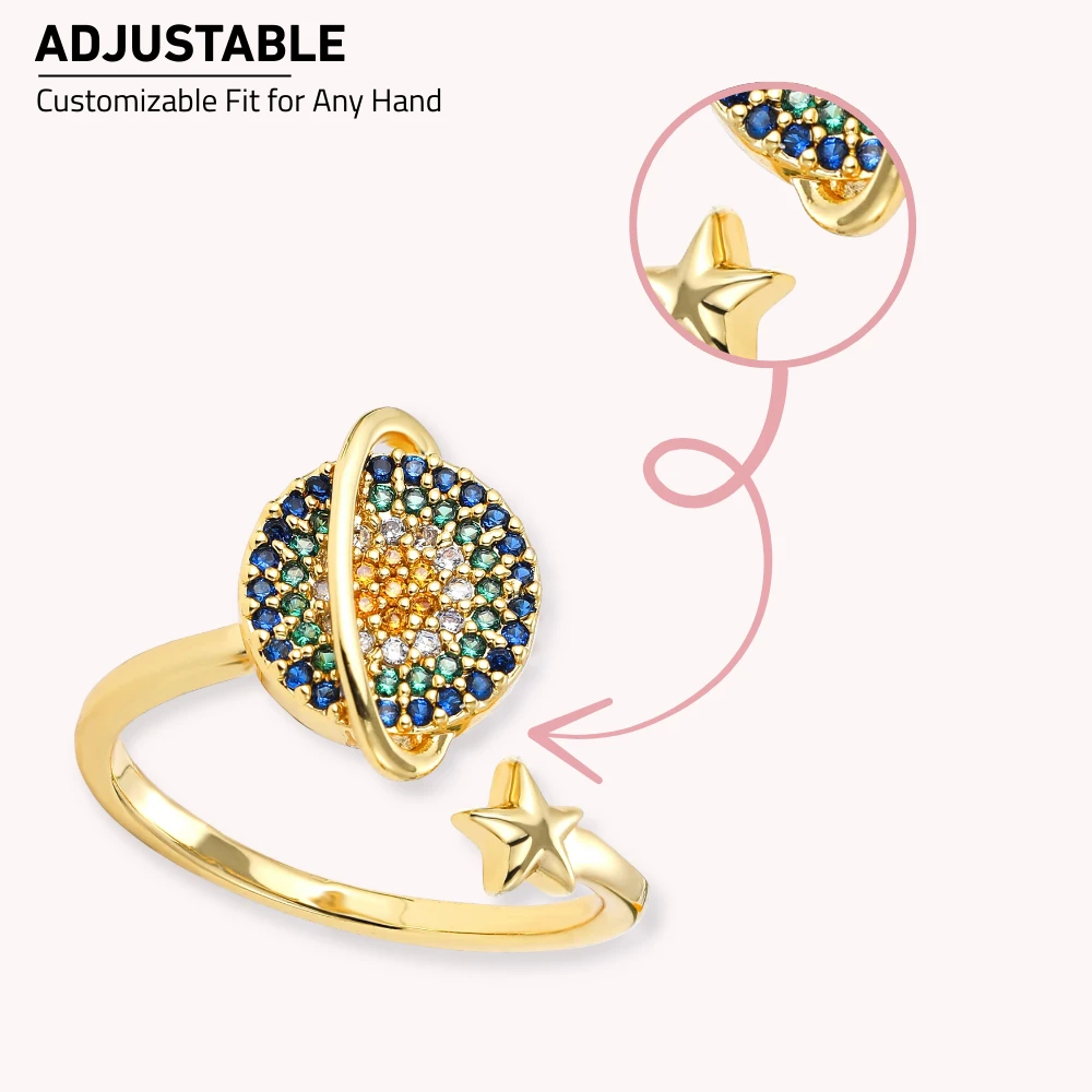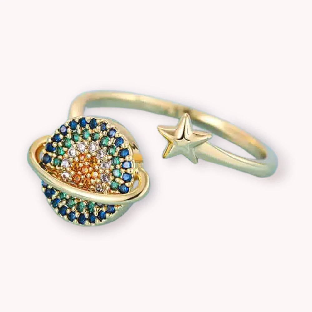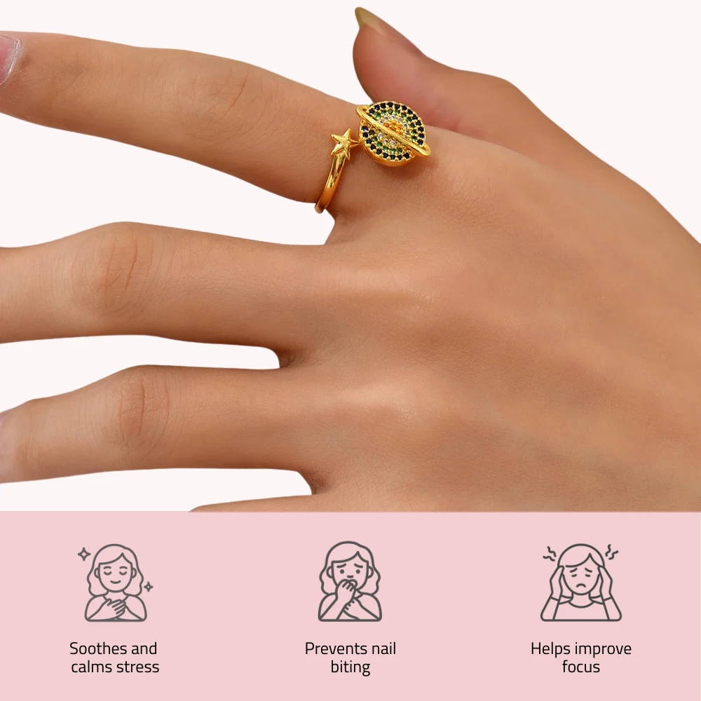 The ring features a rotating central element (planet-shaped) that you can discreetly spin with your fingers. This repetitive motion helps reduce anxiety, improve focus, and calm the mind.