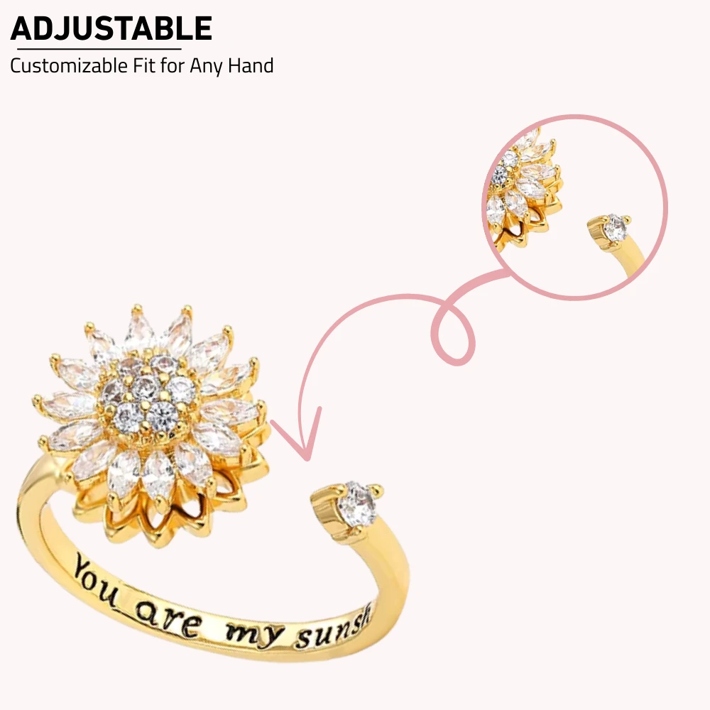✨Experience a soothing 360° rotation with this adjustable stainless steel ring, enhanced by a refined sunflower and a sparkling crystal that spin with fluid elegance.✨