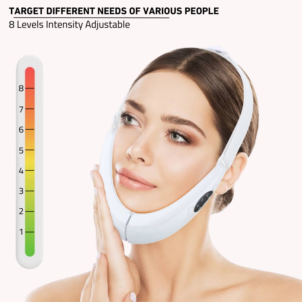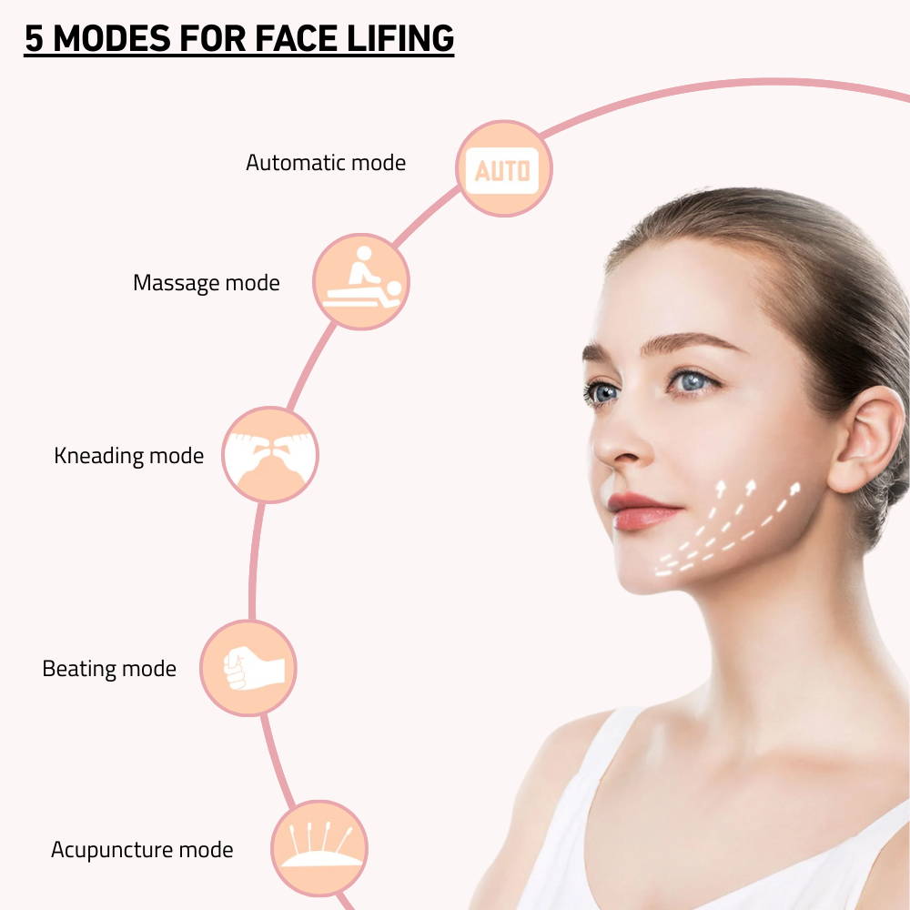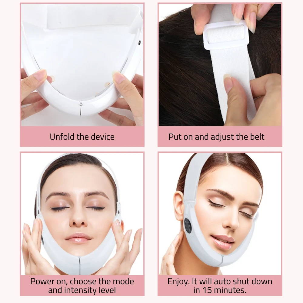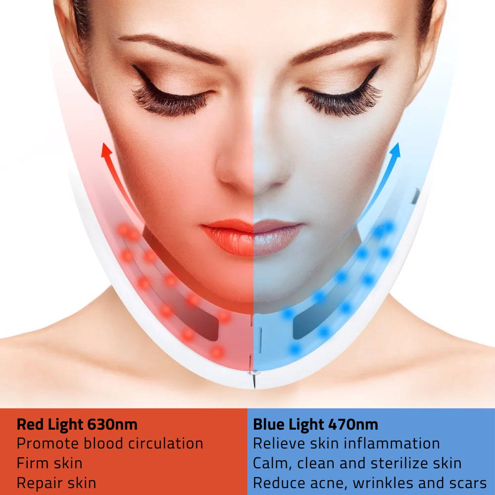 The device uses a combination of micro-vibrations and multi-color LED lights (red, blue) to stimulate facial muscles, firm the skin, reduce double chin, and improve circulation.
