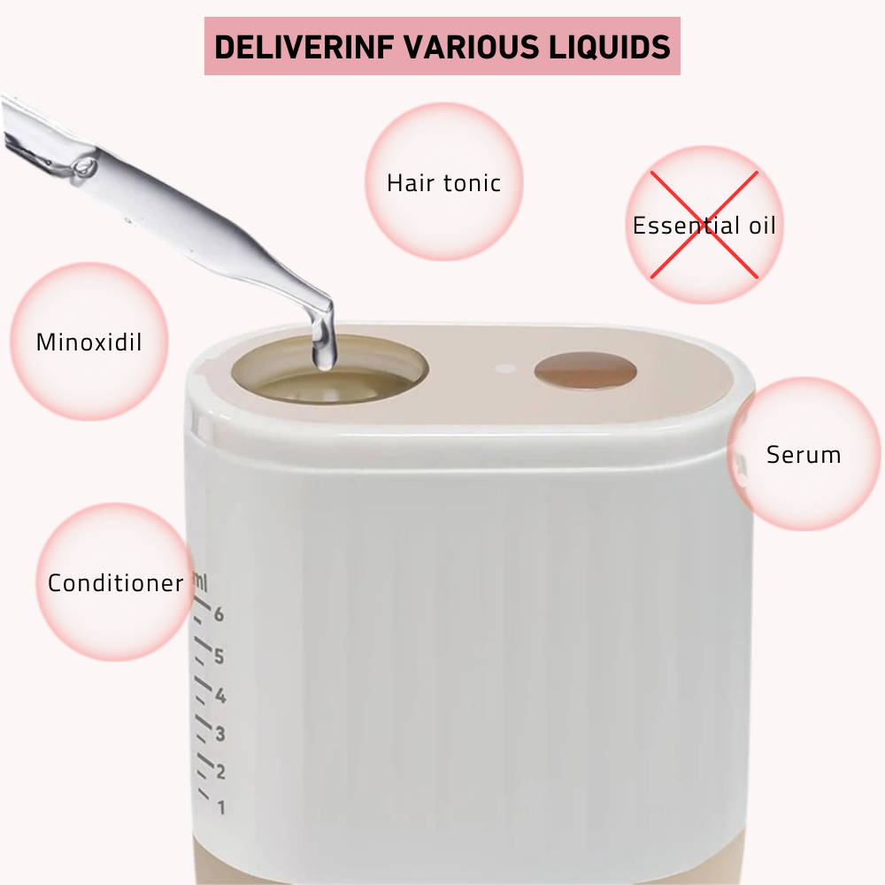 You can use serums, light oils, liquid lotions, or hair tonics. Avoid formulas that are too thick or contain solid particles, as they may clog the dispensing system.