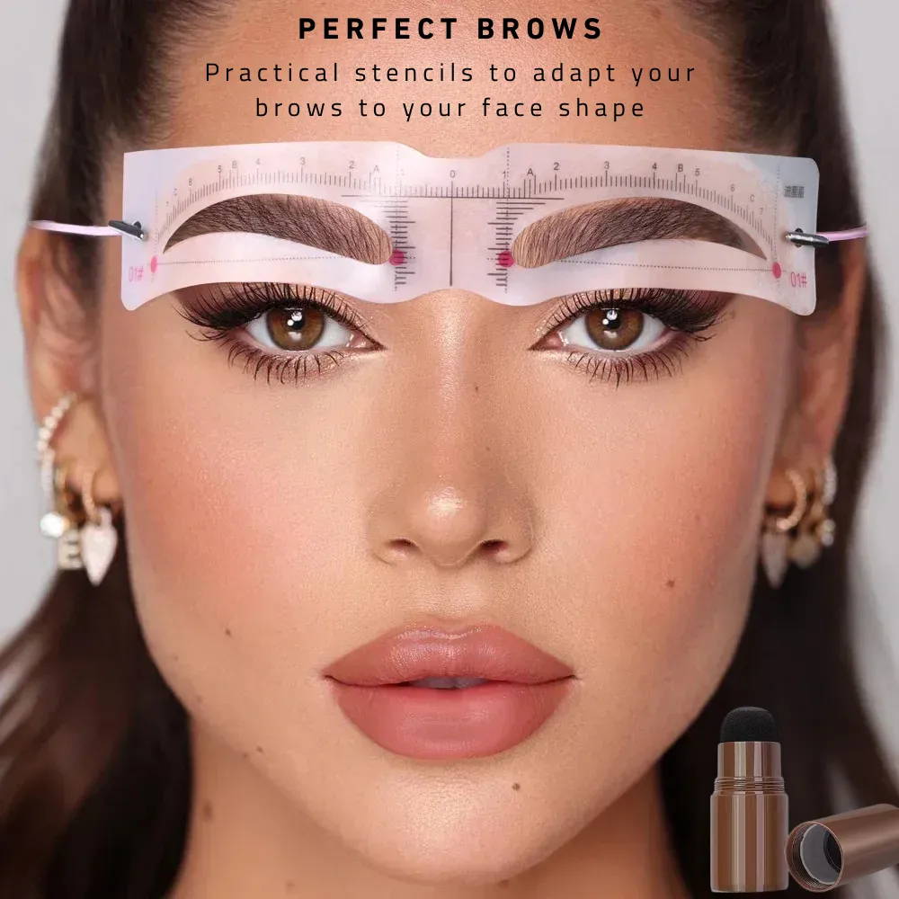 This kit helps create perfectly shaped, symmetrical brows easily, using a precise measuring stencil and a simple powder stamp for effortless application.