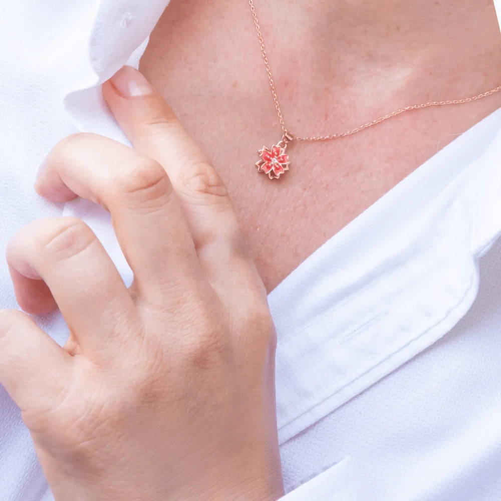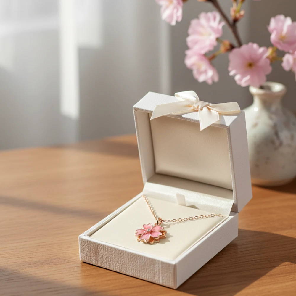 It tolerates everyday moisture but should be removed before swimming or showering. Proper care helps maintain its shine and ensures the peach-flower pendant stays beautiful over time.