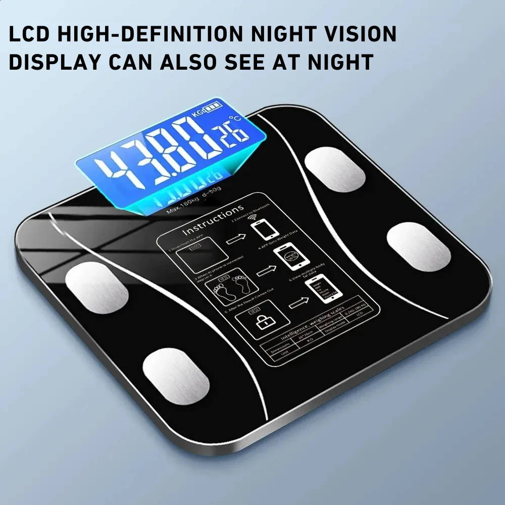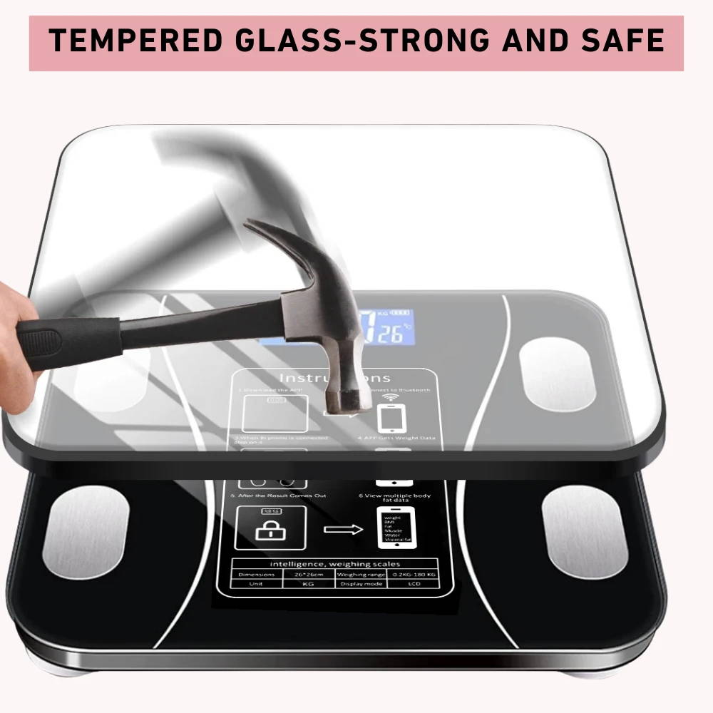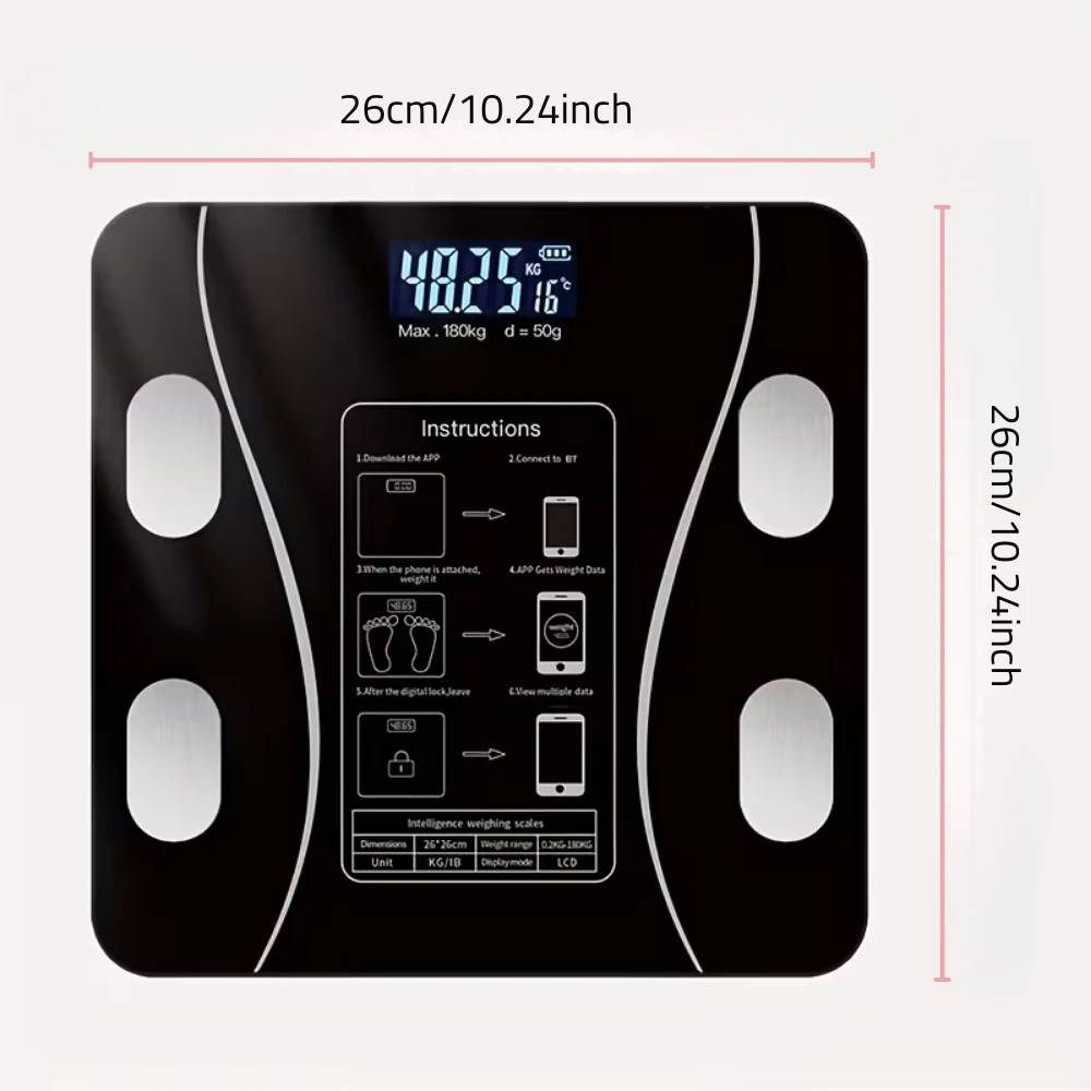 It measures weight and calculates BMI plus body composition metrics using bioelectrical impedance. Results appear on the screen and inside the app for easier tracking over time.