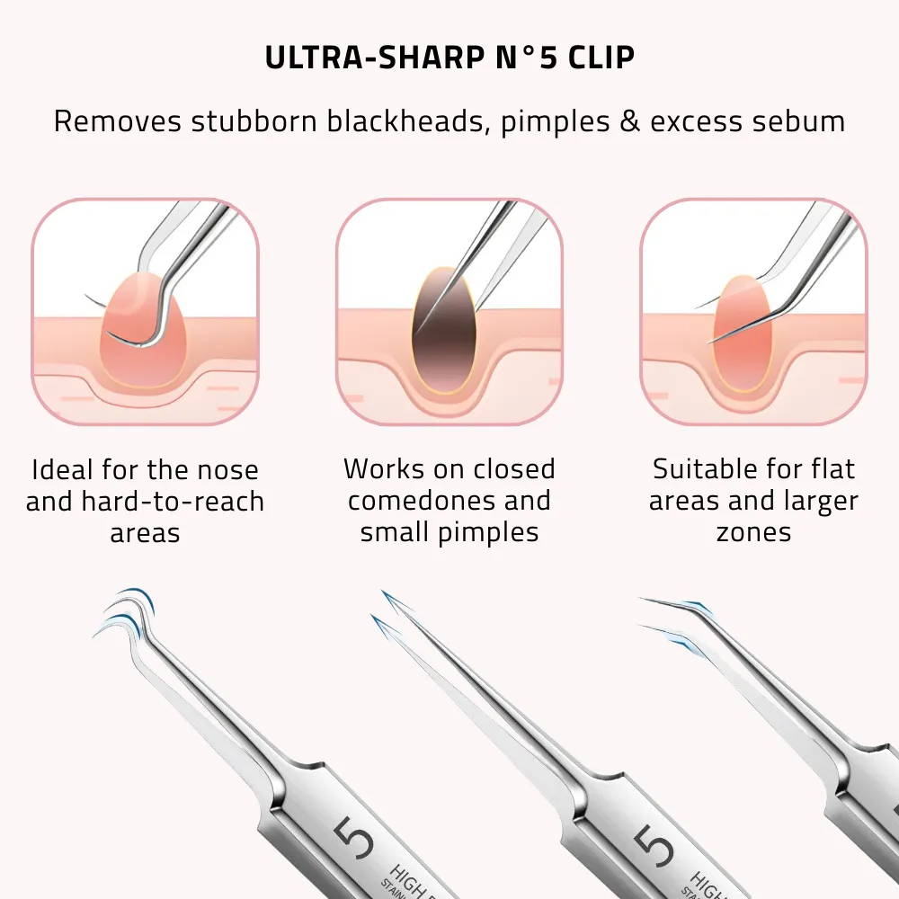 Yes. The fine tips and No.5 clip are designed to reach nose edges and narrow zones. This allows more accurate extraction with less harsh pressure compared to manual squeezing.