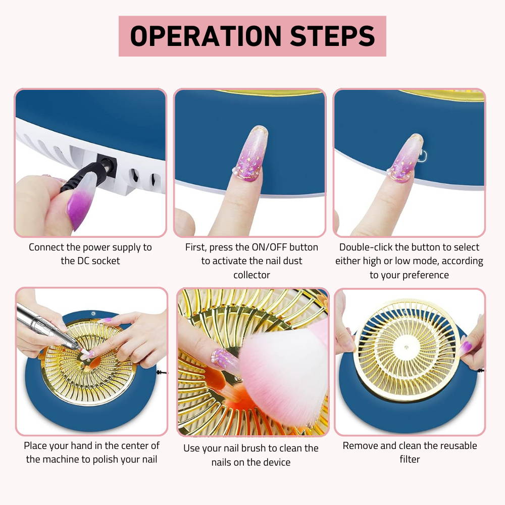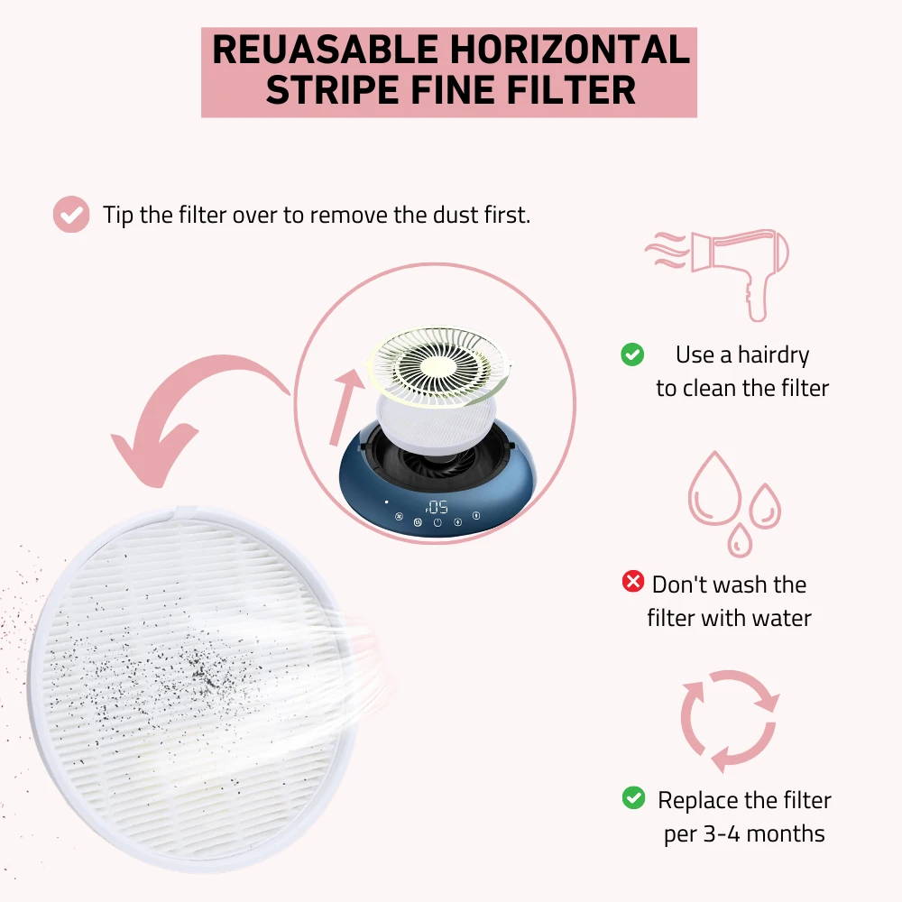 To clean the reusable filter, simply remove it from the dust collector using the magnetic cover, and use a hairdryer or nail duster to remove any accumulated dust. This easy maintenance helps ensure optimal performance.