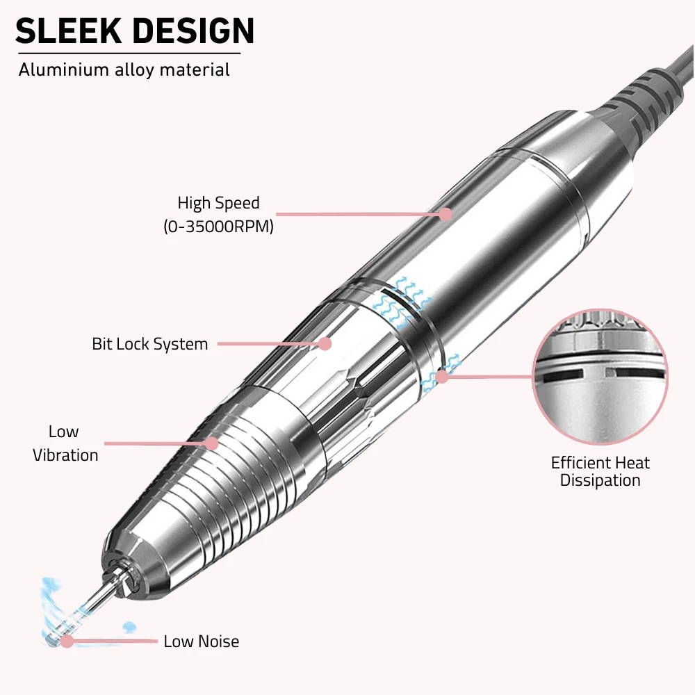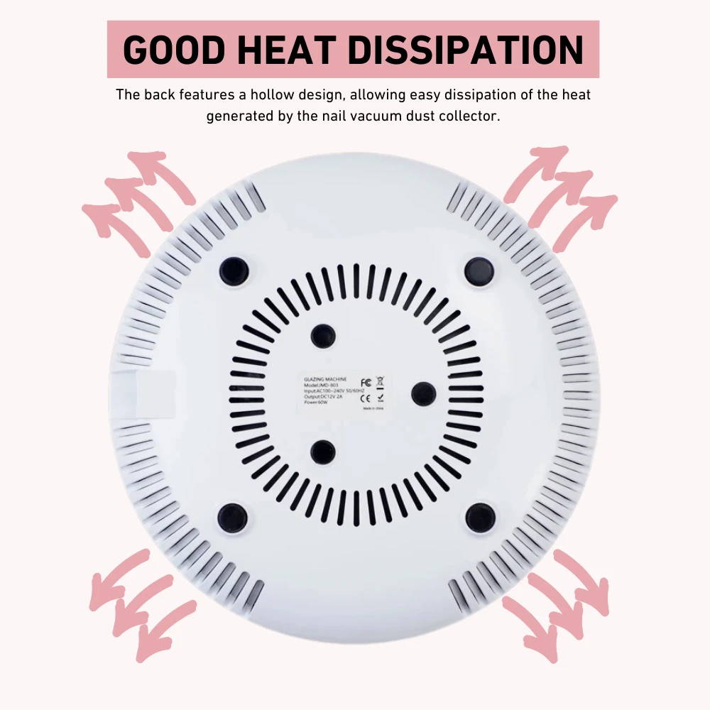 The Vacuum Nail Dust Collector is designed with a non-slip pad on the back, ensuring stability and preventing any unwanted sliding during use. Additionally, the large surface and tapered edge provide a comfortable wrist rest.